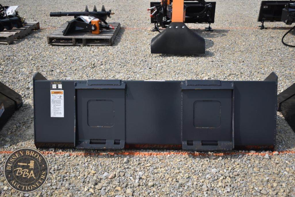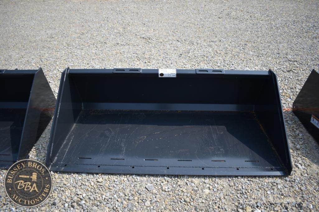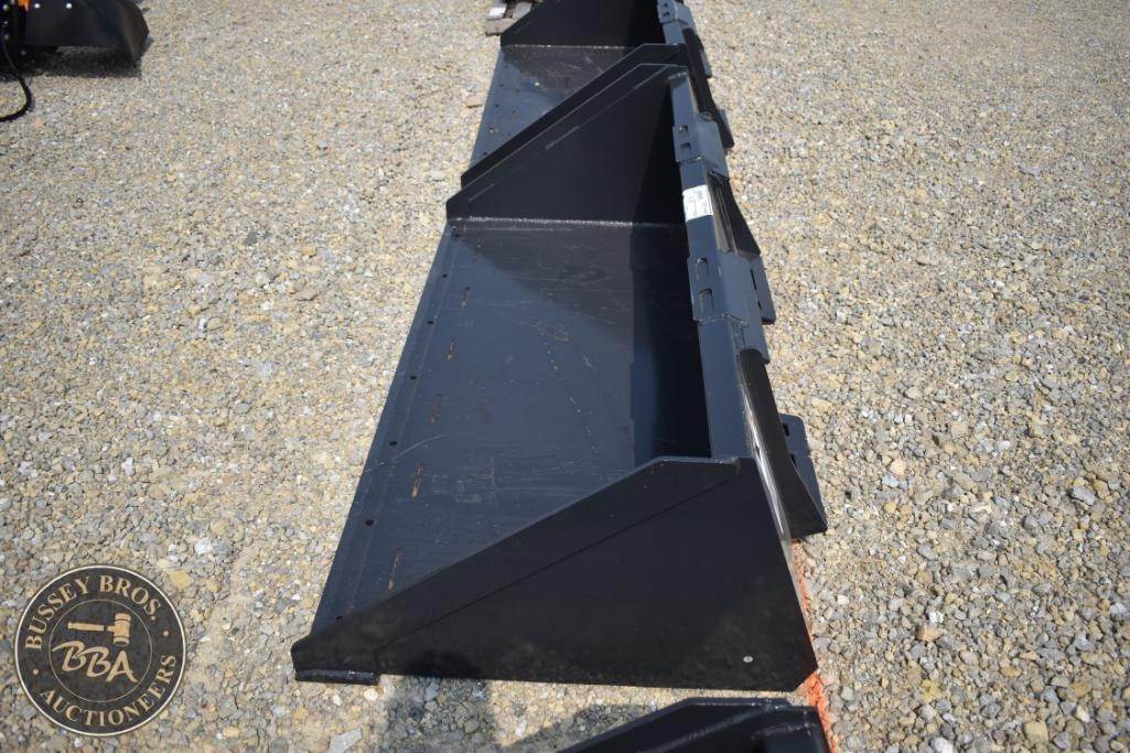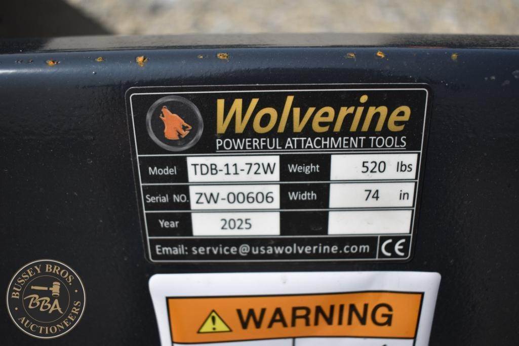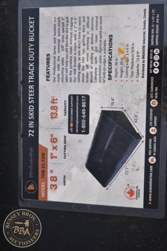 Wolverine Skid Steer Track Duty Bucket, Model TDB-11-72W, 520 lbs, 74 in width, 38 cubic feet capacity, heavy-duty design, reinforced sides, 72 in cutting edge, compatible with skid steer loaders, black color, steel material, Serial Number: ZW-00606.