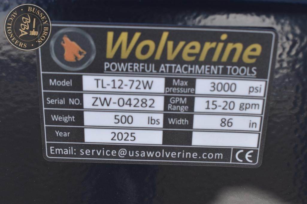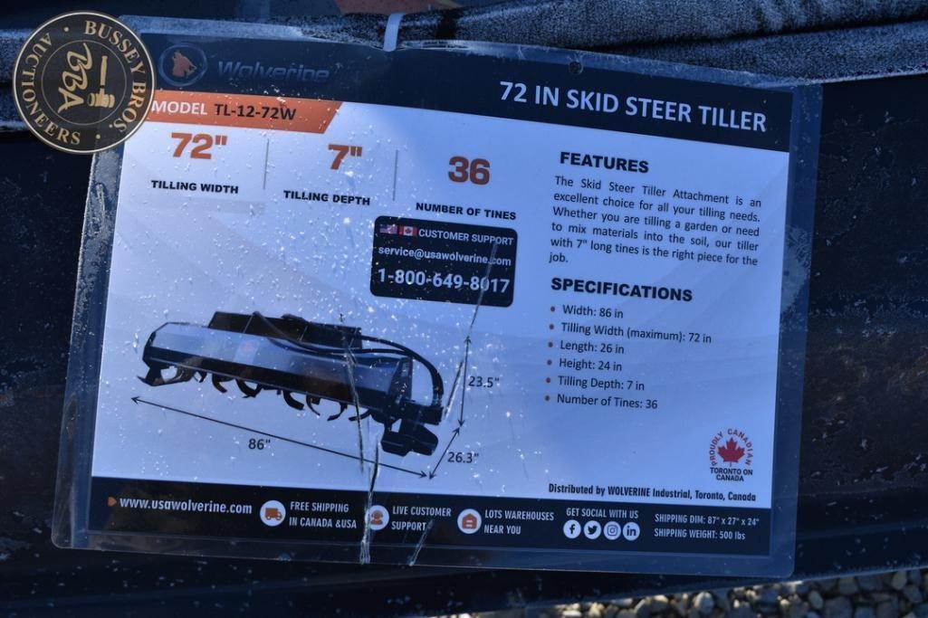 Wolverine Tiller Attachment Skid steer mount, hydraulic, 72 inch wide SN:ZW04282, NEW/UNUSED