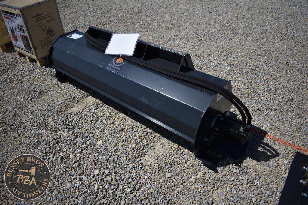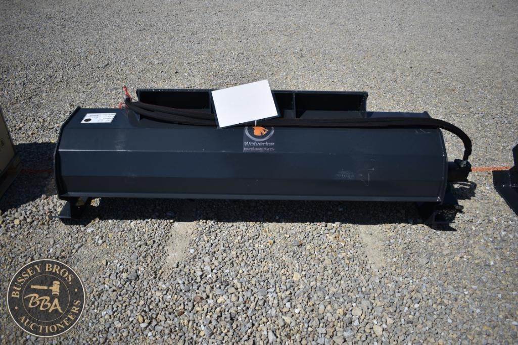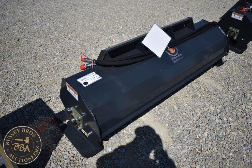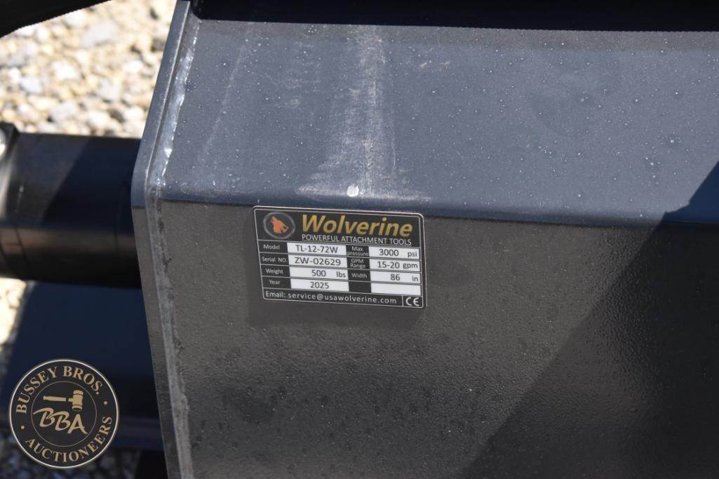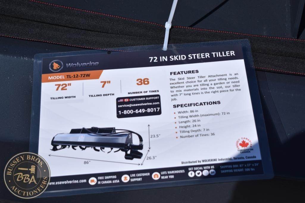 Wolverine TL-12-72W Skid Steer Tiller Attachment, featuring 72" tilling width, 7" tilling depth, 36 tines, hydraulic power source, compatible with standard skid steer loaders, weight 300 lbs (136 kg), Serial Number: ZW-024629.