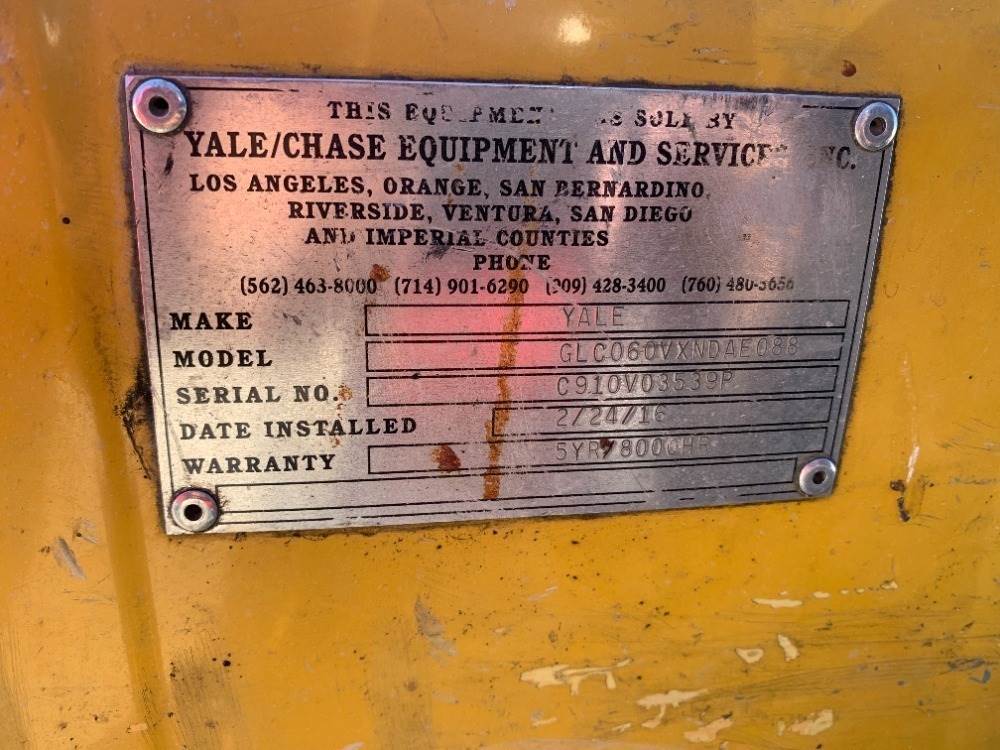 YALE GLC060VX FORKLIFT, 6,000#, 84" mast, 3-stage, 186" lift, sideshift, fork positioners, lpg, canopy, solid tires. s/n:C910V03539P