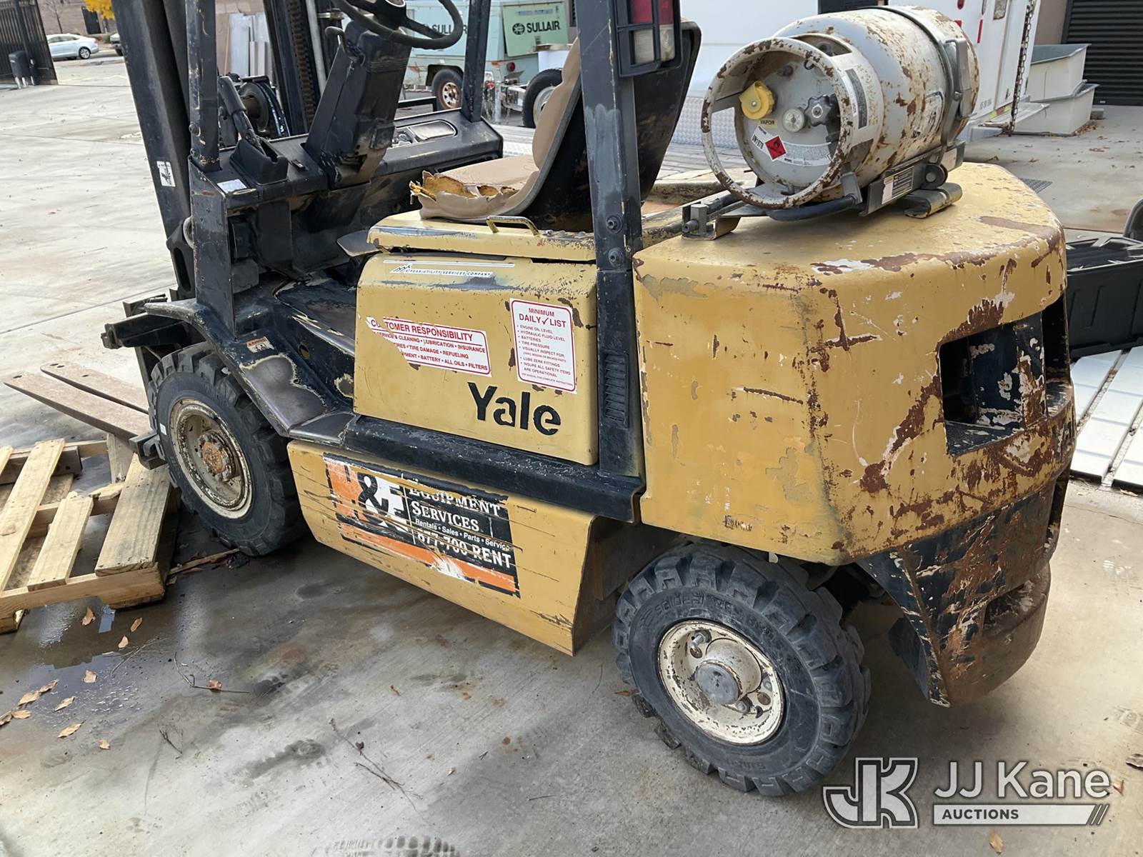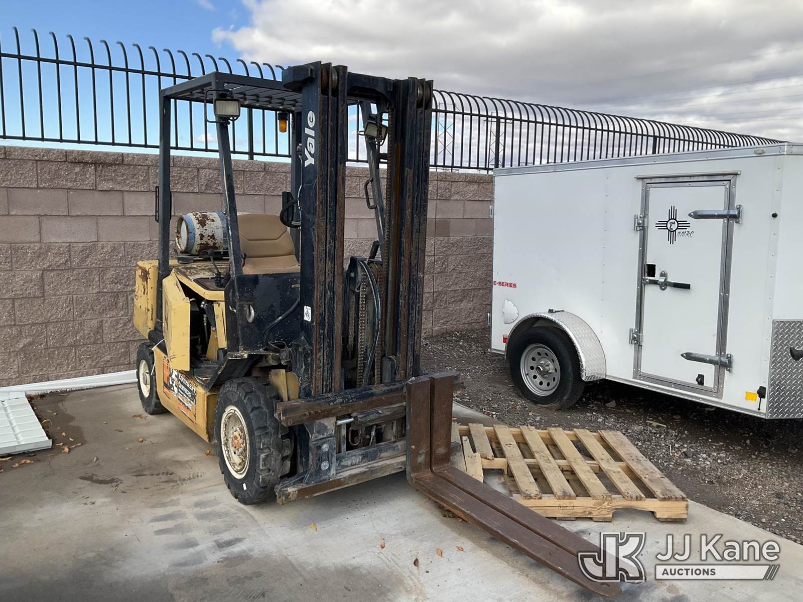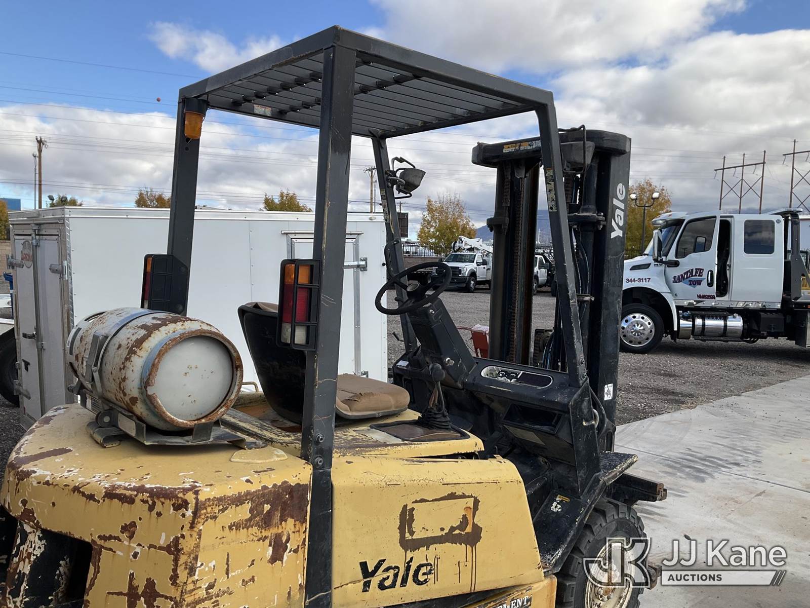 Yale GLP-050 Pneumatic Tired Forklift, s/n AB75B11512X, Shuttle, LPG, with 5000lbs capacity, 194in fork height, 3 stage Triplex w/ side shift, (Runs & Moves) (Leak In LPG Hose - Operating Condition Unknown) NOTE: This unit is being sold AS IS/WHERE IS via Timed Auction and is located in Albuquerque, NM. For more information & removal arrangements please contact Armando Beltran @ (505) 991-0312. Load out by appointment only, Buyer/Hauler must present copy of paid invoice upon arrival. Purchaser acknowledges ALL lots must be removed within 5 business days of Auction, or a storage fee may be incurred. For load out and pick up information, please reference the release form sent out after purchase. (Buyer is responsible for removal. Assistance by consignor or JJ Kane Auctions is not assured.)