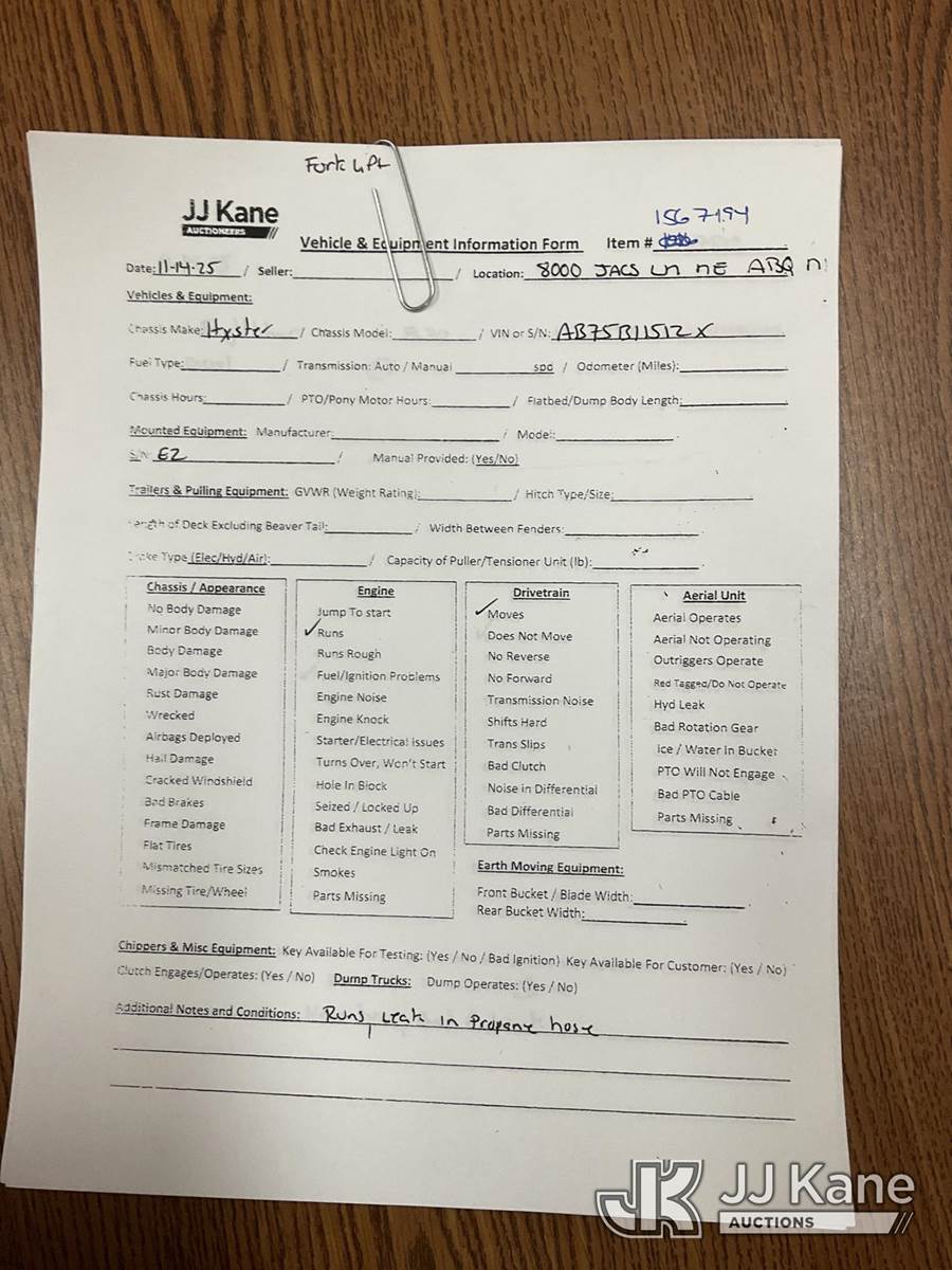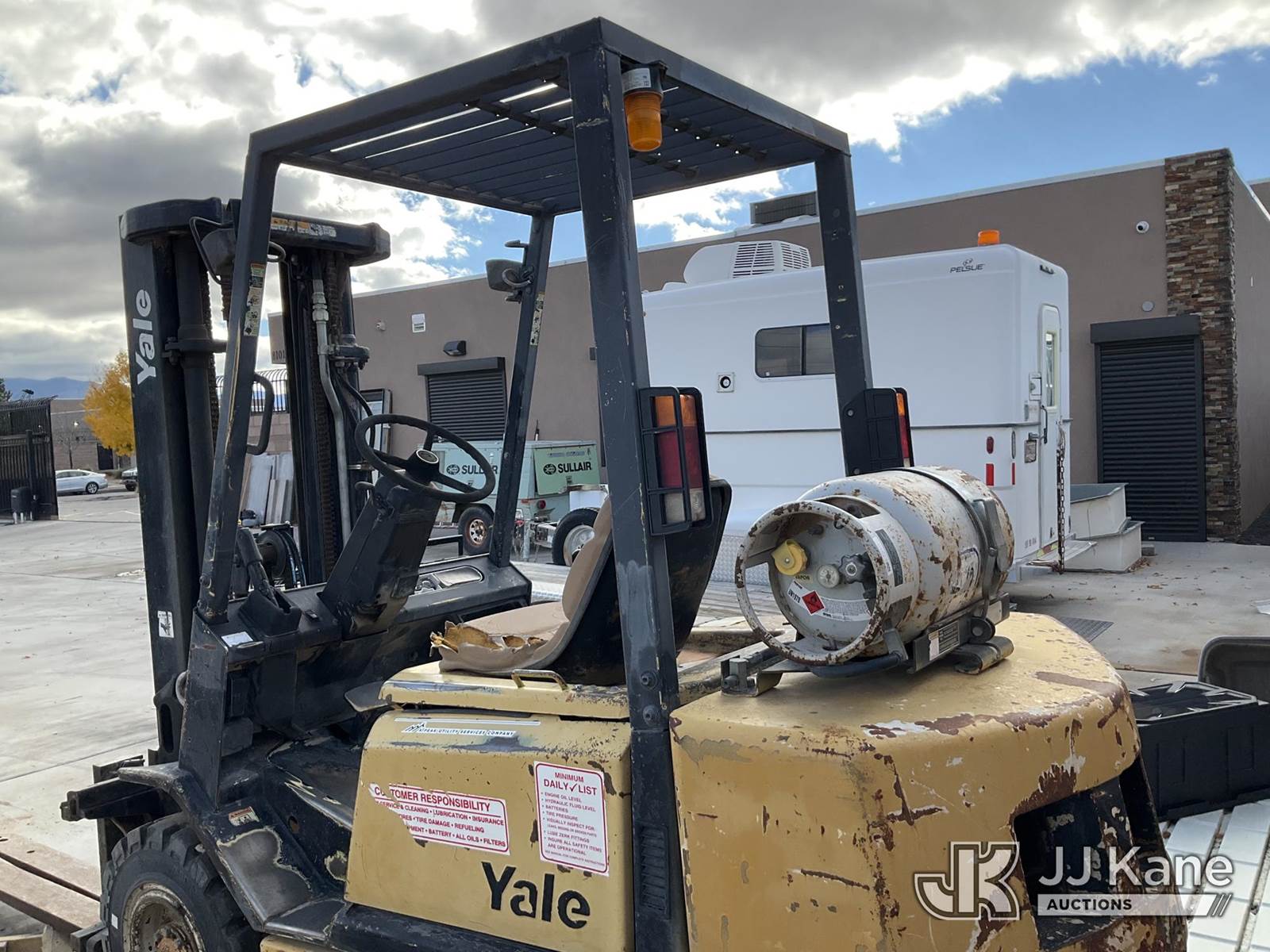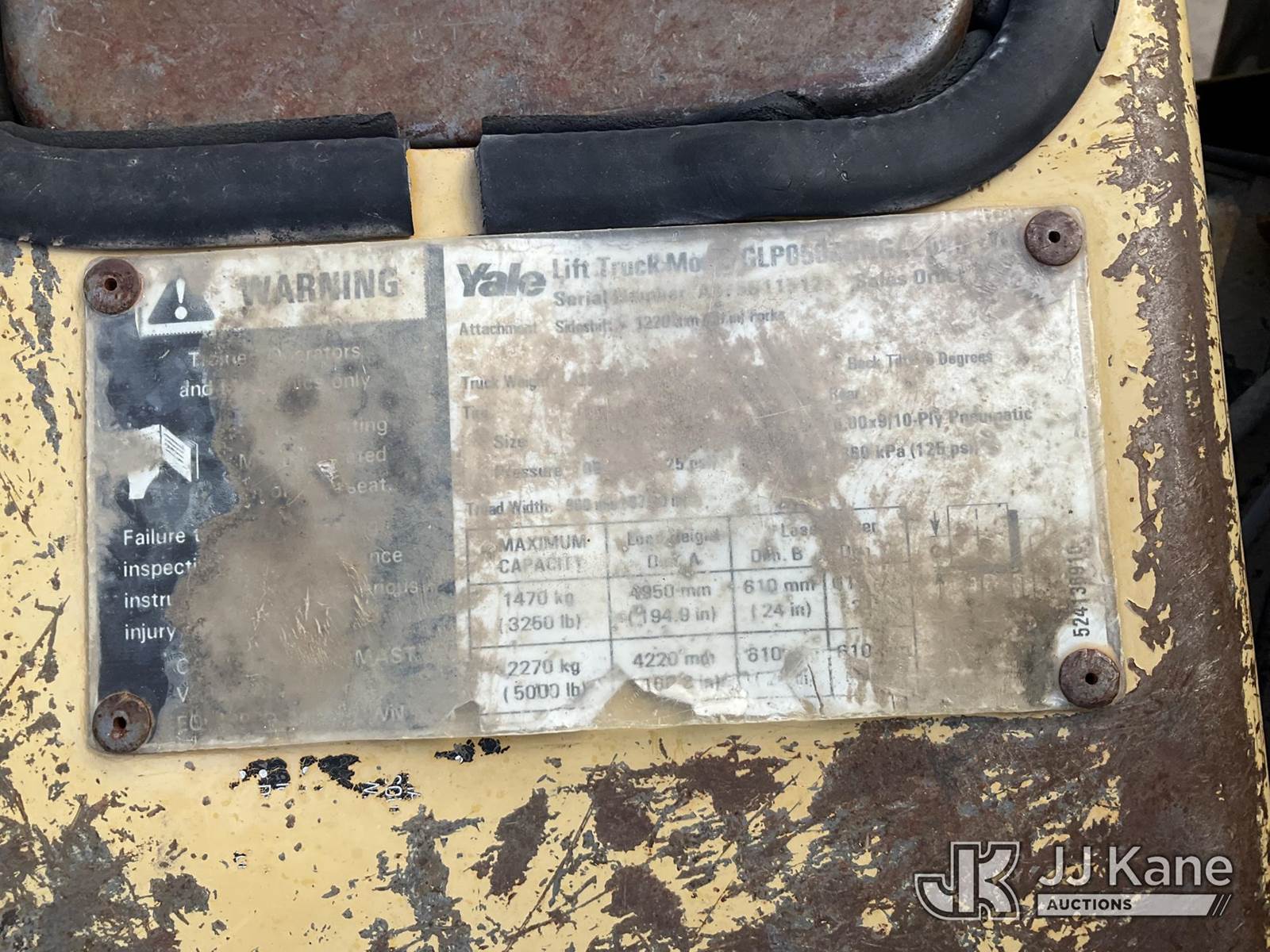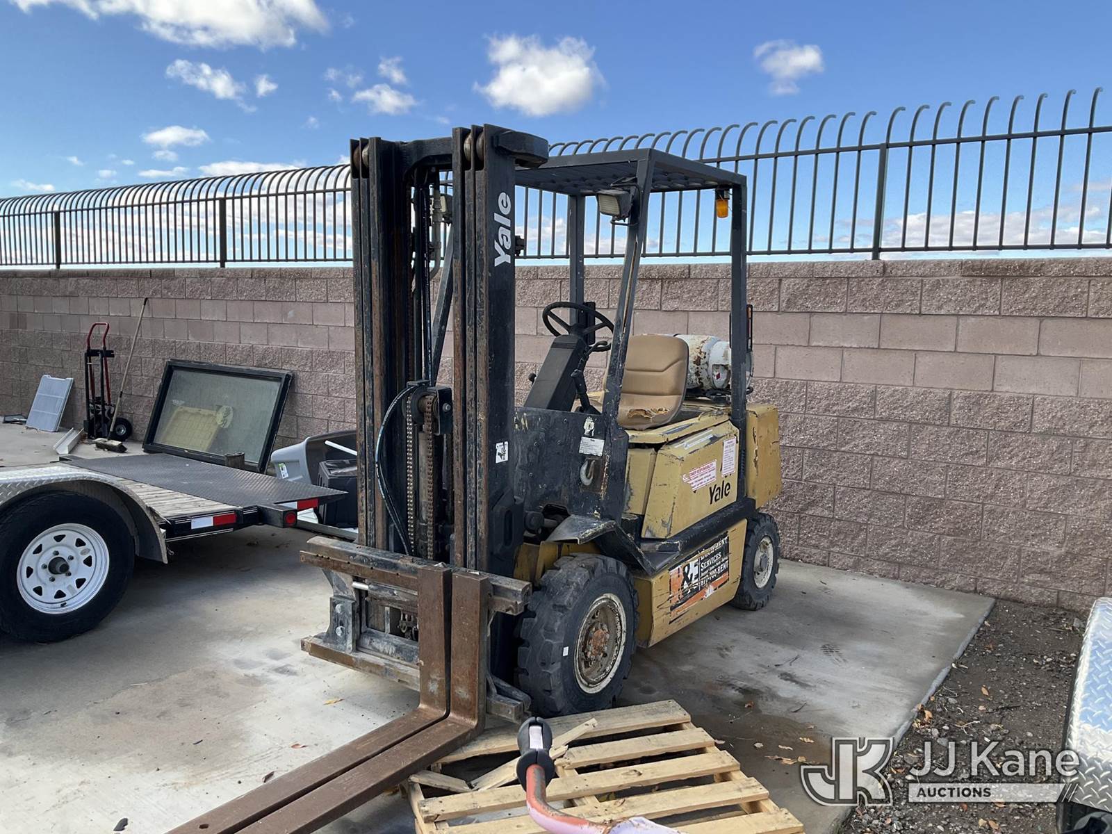 Yale GLP-050 Pneumatic Tired Forklift, s/n AB75B11512X, Shuttle, LPG, with 5000lbs capacity, 194in fork height, 3 stage Triplex w/ side shift, (Runs & Moves) (Leak In LPG Hose - Operating Condition Unknown) NOTE: This unit is being sold AS IS/WHERE IS via Timed Auction and is located in Albuquerque, NM. For more information & removal arrangements please contact Armando Beltran @ (505) 991-0312. Load out by appointment only, Buyer/Hauler must present copy of paid invoice upon arrival. Purchaser acknowledges ALL lots must be removed within 5 business days of Auction, or a storage fee may be incurred. For load out and pick up information, please reference the release form sent out after purchase. (Buyer is responsible for removal. Assistance by consignor or JJ Kane Auctions is not assured.)