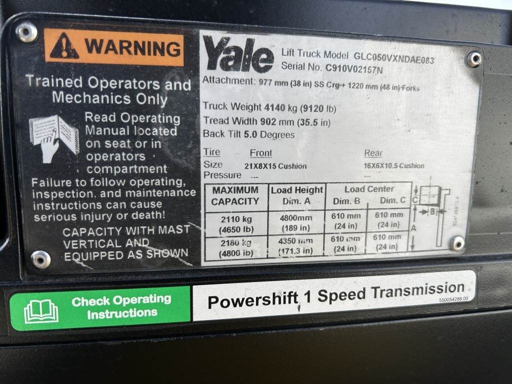 Location: Spokane WA ***End-User Consignment*** S/N: C910V02157N Engine: PSI 2.4L 4cyl LP/Gas Transmission: Powershift 42" Forks, 3 stage mast, 189" height, 4,800lb capacity, 5 degree back tilt, OROPS, work lights, beacon light, 21x8x15 front tires, 16x6x10.5 rear tires. Hours: 9,442